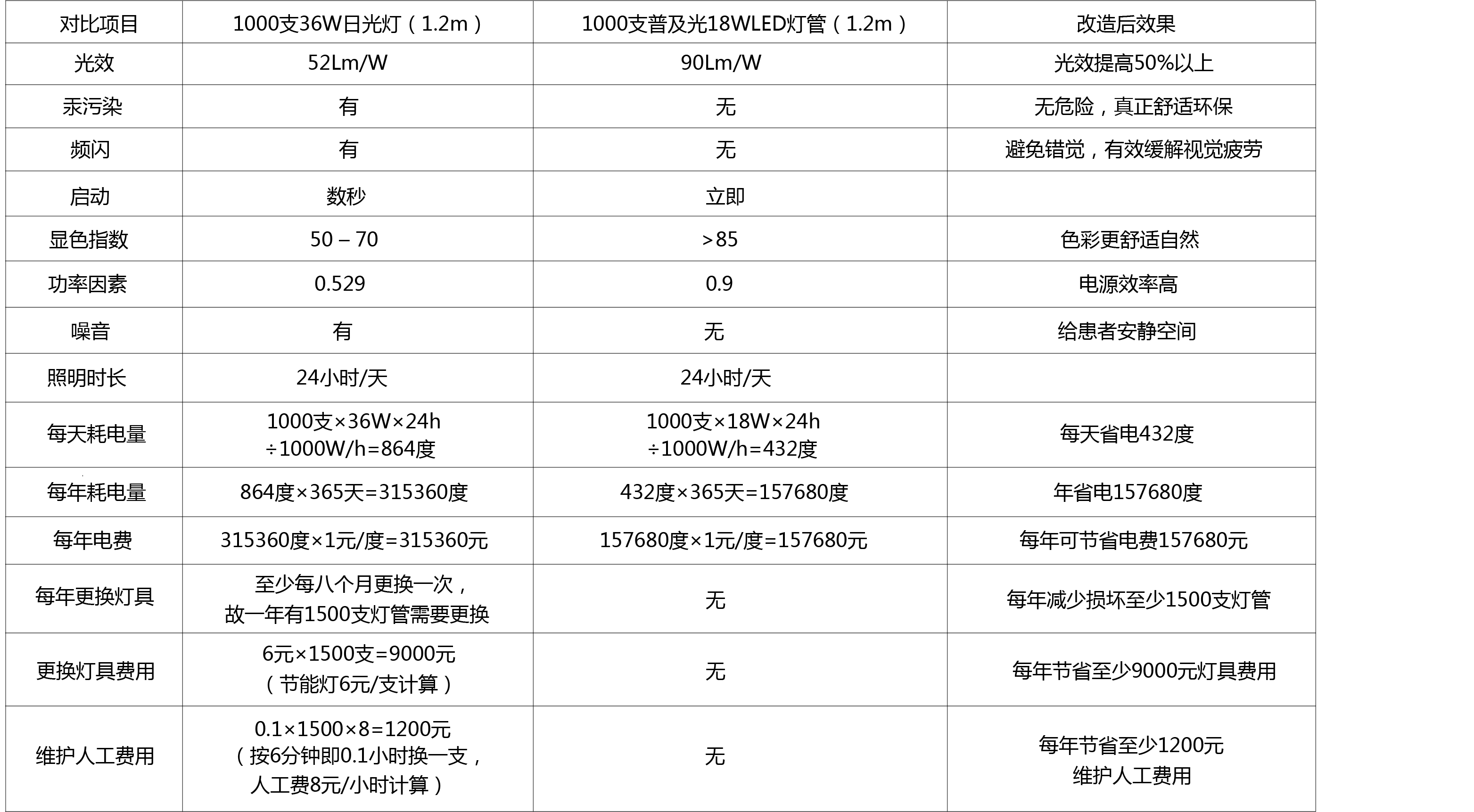 Summary: in addition to the initial investment of more than 60 yuan *1000 =60000 support; Annual maintenance cost savings of 9000 yuan +1200 yuan =10200 yuan, 157680 yuan per year to save electricity; See the transformation of less than half a year to recover the cost of it; After the annual light can also save costs 167880 yuan.
