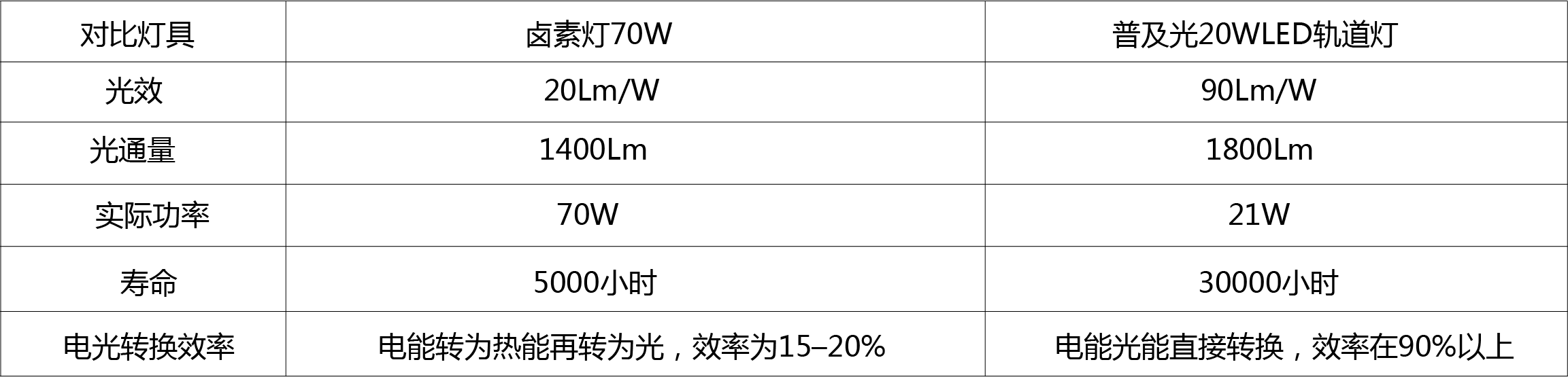 LED is a solid state cold light source, low voltage DC drive, direct electric energy into light energy, electro optical power conversion is close to 90%. And halogen lamp luminous principle is using the object heating light-emitting principle and the principle of thermal radiation of, only 17% - 20% can be converted into light energy, while the rest parts are to heat dissipation, resulting in fever, if the air conditioner indoor will increase cooling capacity to form a secondary energy consumption.