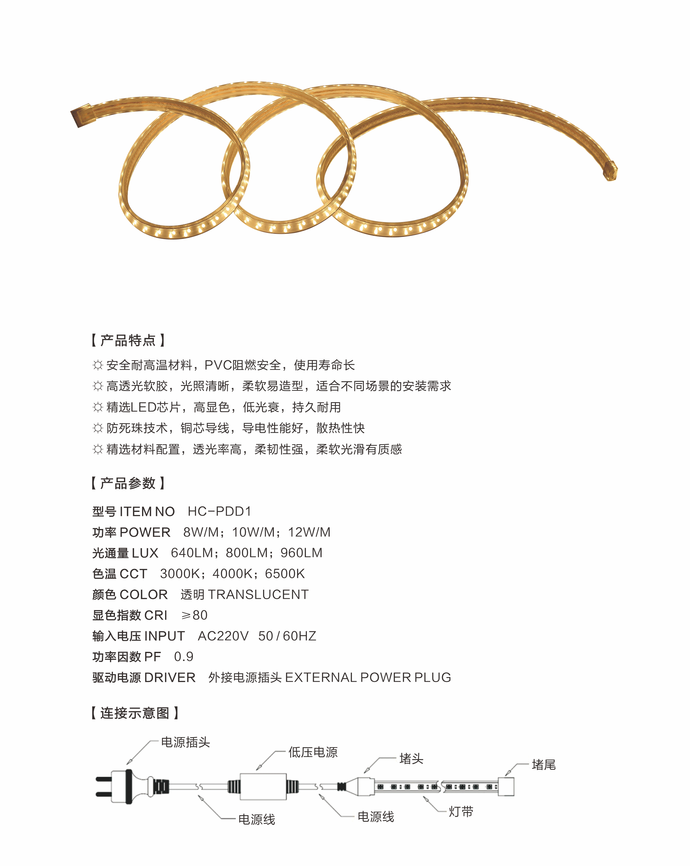 ? 安全耐高溫材料,PVC阻燃安全,使用壽命長 ? 高透光軟膠,光照清晰,柔軟易造型,適合不同場景的安裝需求 ? 精選LED芯片,高顯色,低光衰,持久耐用 ? 防死珠技術,銅芯導線,導電性能好,散熱性快 ? 精選材料配置,透光率高,柔韌性強,柔軟光滑有質感